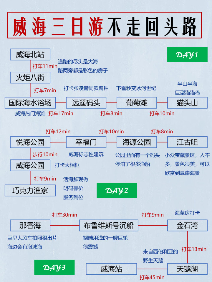 DAY1:威海北站—火把八街—海外海水浴场—远遥船埠—葡萄滩—猫头山