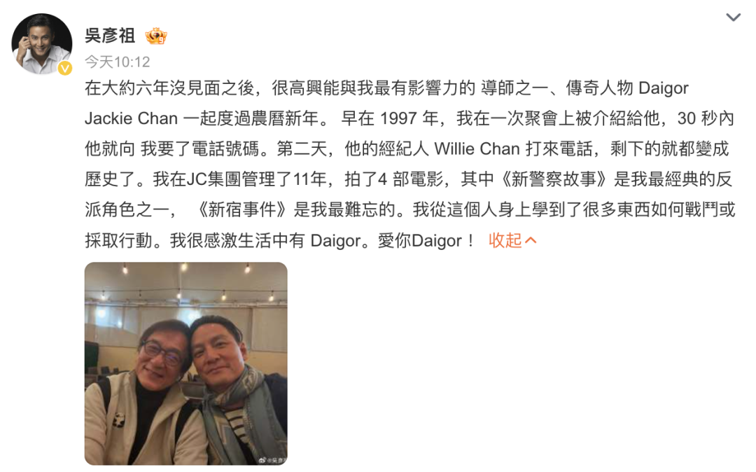 在苟简六年没碰面之后,很振奋能与我最有影响力的导师之一、听说东说念主物 Daigor Jackie Chan统共渡过农历新年。早在1997年,我在一次约会上被先容给他,30 秒内他就向我要了电话号码。第二天,他的牙东说念主Willie Chan打回电话,剩下的就齐形成历史了。我在JC集团责罚了11年,拍了4 部电影,其中《新窥探故事》是我最经典的邪派脚色之一, 《新宿事件》是我最牢记的。我从这个东说念主身上学到了许多东西何如战争或採取活动。我很戴德生计中有 Daigor。爱你Daigor !
