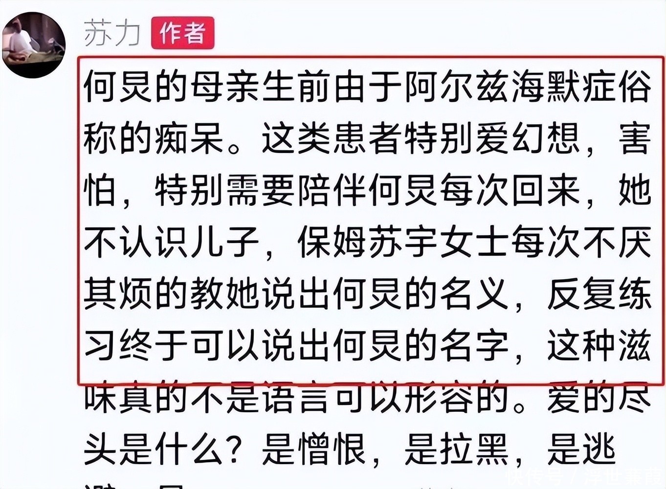 37. 当先,何炅躬行管理母亲,但跟着母亲确诊阿尔茨海默症(俗称老年镇静),使命冗忙的他实在无法兼顾,遂聘用保姆苏宇协助照护。