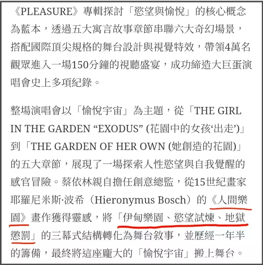 再来即是蔡依林演唱会主题“愉悦天地”,演唱会宣传稿瓦解蔡依林本东谈主担任了演唱会创意总监,她从画作《东谈主间乐土》赢得灵感,把“伊甸乐土、生机真金不怕火狱、地狱解决”三幕式结构化作舞台故事,不异属于西方宗教元素。