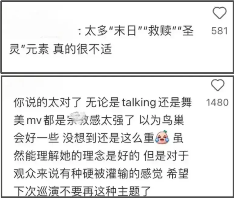 联念念到邓紫棋也因为演唱会波及无数西方宗教元素遭到质疑,从邓紫棋到蔡依林,她们演唱会激发的一系列争议,归根结底如故文化相反。
