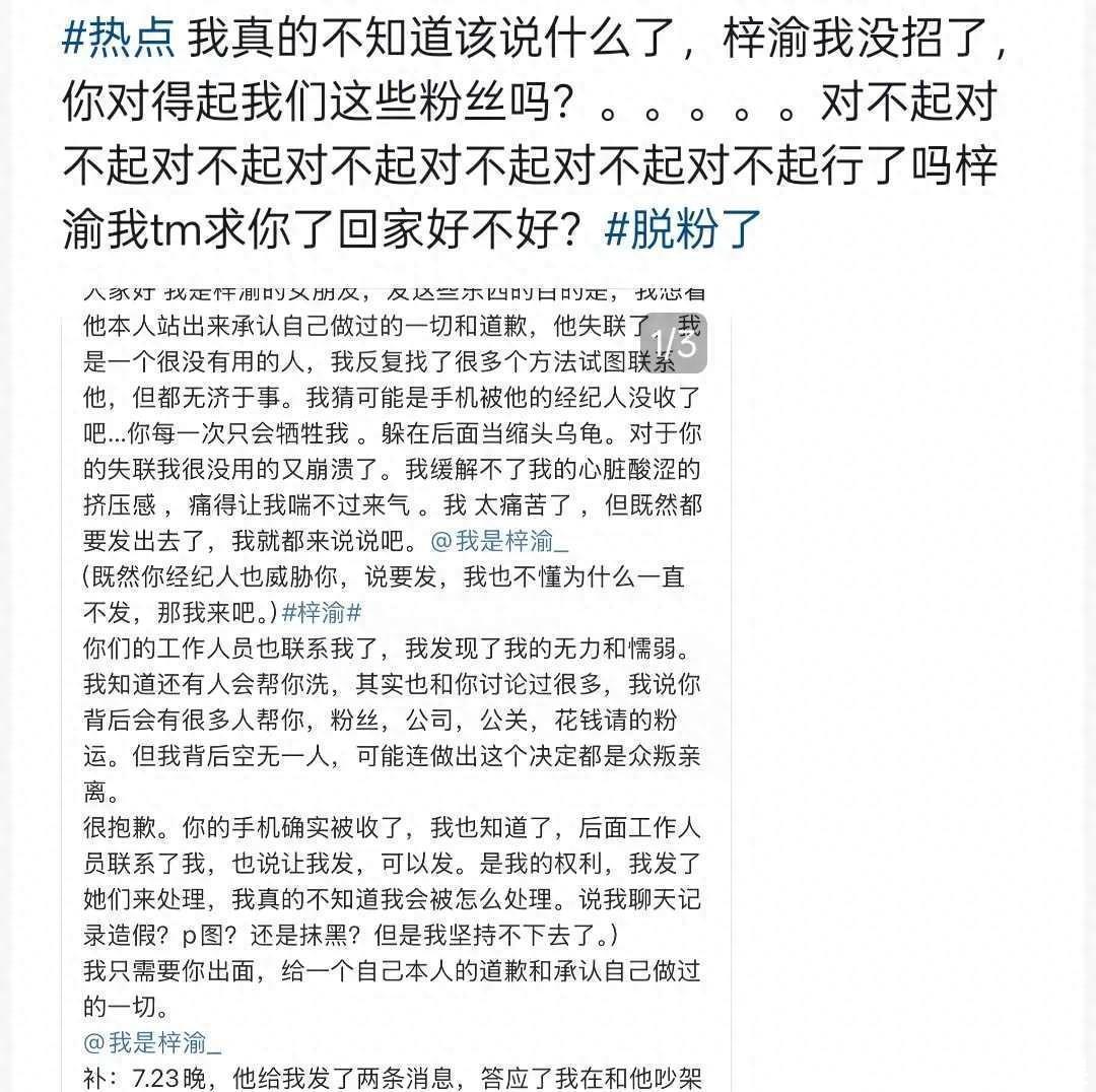 最近文娱圈音讯一个接一个,三天时辰爆出好几条大新闻。有东谈主追剧发现男主演被曝出轨,有东谈主开演唱会戴面罩被骂,还有东谈主孕珠多年藏着掖着,截止被网友扒得底朝天。这些事里最火确当属演员梓渝了,之前他靠双男主剧火得不可,粉丝王人说他流露奋力,截止现时被前女友举报出轨、冷暴力,还被另一个女生说是渣男惯犯。