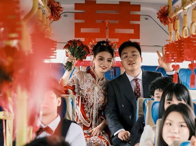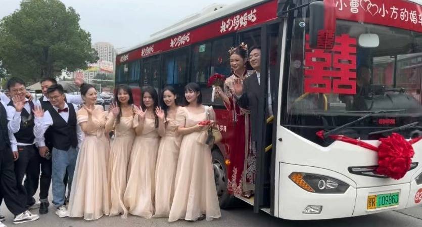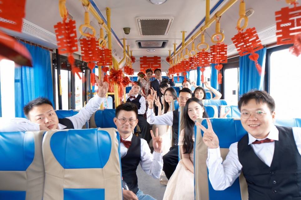 “公交车空间大,不错容纳20多东说念主,咱们一转东说念主包括我和内助、伴郎伴娘以及影相师坐上后,车内还是尽头宽敞。”曹宇浩说,他和一又友提前一天到公交公司对婚车进行了悉心装饰,车内挂满了喜字,车头则袒护了大红花球,使得整辆公交车飘溢着喜庆的氛围。