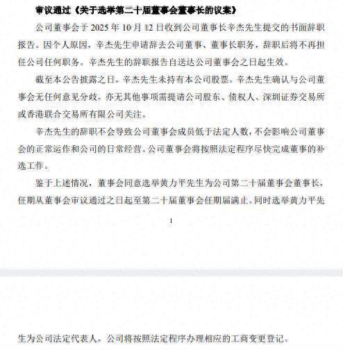 公告称,辛杰先生的离职申报自投递董事会之日起见效。辛先生未抓有公司股票,并说明与董事会无任何见识不对,亦无其他事项需提请公司推动、债权东谈主、深圳证券来回所或香港齐集来回通盘限公司关切。辛先生的辞任不会导致董事会成员低于法定东谈主数,不会影响董事会的平常运作和公司的日常目标。董事会将按照法定纪律尽快完成董事的补选职责。