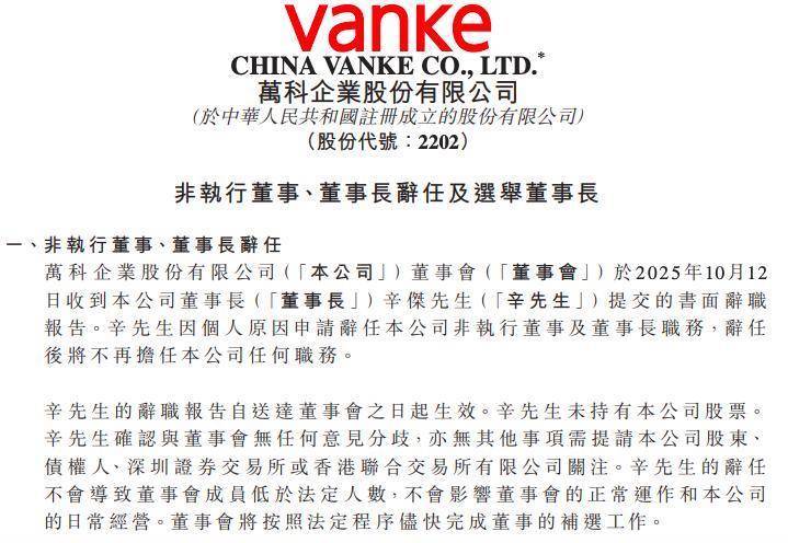 10月13日,万科企业在港交所公告称,公司董事会于2025年10月12日收到董事长辛杰先生提交的书面离职申报。辛杰先生因个东谈主原因央求辞任公司非奉行董事及董事长职务,辞任后将不再担任公司任何职务。同期,第二十届董事会第二十四次会议已选举黄力平担任董事长。