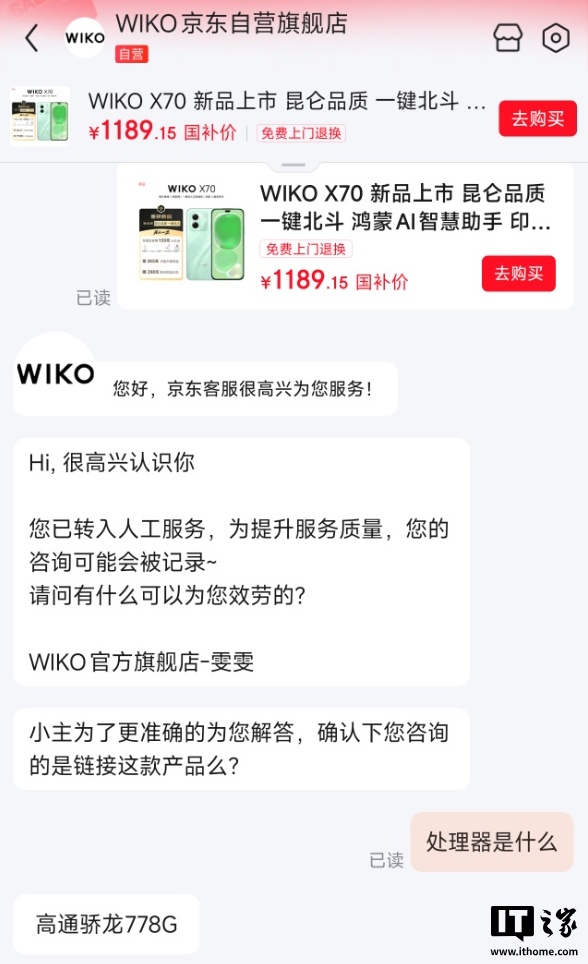 IT之家随后商酌 WIKO 京东自营旗舰店客服,获悉 WIKO X70 的处分器为高通骁龙 778G。